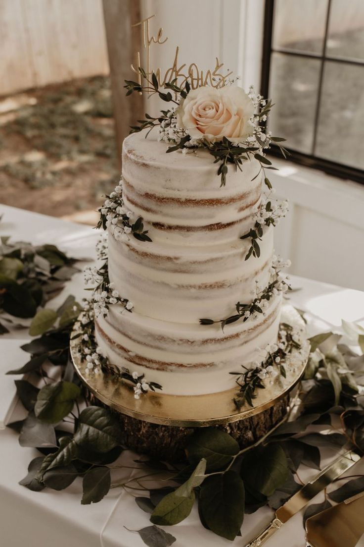 Polonahá torta s povrchom z krému, s jemnými kvetmi, eukalyptom a nevestiným závojom.